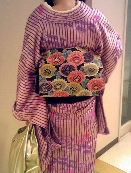 何度見ても何故こうなった!と思う、秋草に黒縁取りの赤縞。地色は紫っぽく光るピンク色で、余りにも狂気的で面白い着物です。
