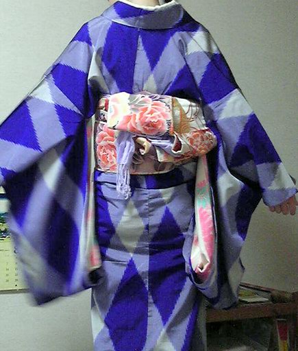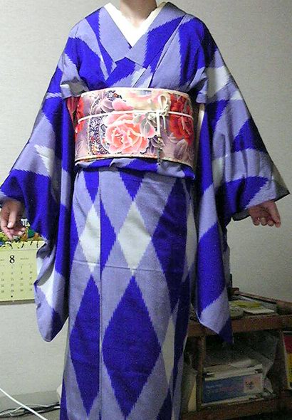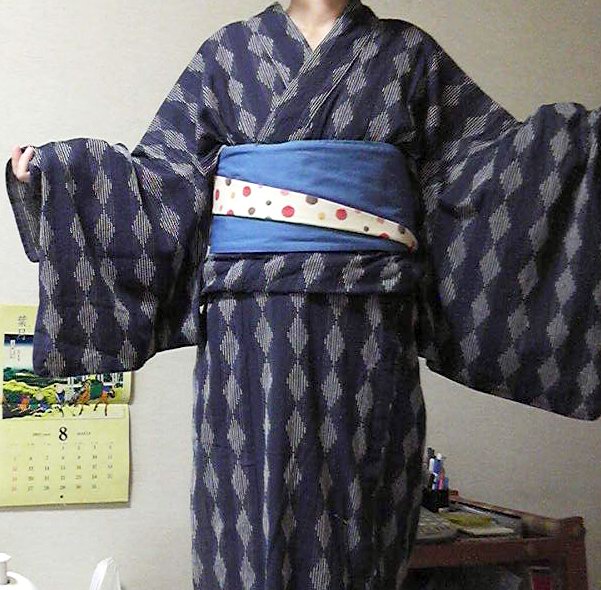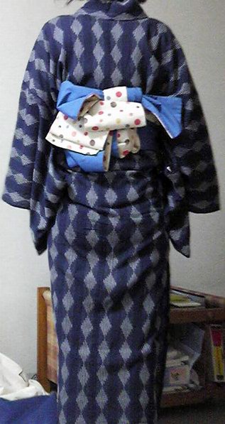 先日、ちょっくら出かける用事があったので、浴衣を着ました。 ひとりだし、地下鉄使いたいしで、そんなつもりは無かったんですが、この夏はほとんど着物を着てないので、じゃ、自転車乗れる(地下鉄最寄り駅までは自転車なので)着物にすりゃいーじゃないか!と。 袴では一度乗っているとはいえ、着物だとどうしても上前がはだける訳で。袴の時は袴でカバー出来ますが、着物だとそうもいかないから、前掛けなどでカバーして乗っているらしい、というのは聞いたことがあるんです。 とはいえ、急に決めたのでそんなカバー出来るようなエプロンは持ってない。じゃあカバーするぐらい身幅が大きいのにすればいいやと思って、一人だしごく気軽な格好としても最適な浴衣にしました。 着付けは着付けですから、ぐるっと巻くような訳にはいきませんが、いつものアンティークなんかよりはずっと安心感のある幅な訳です。 ひとりで買い物なので、ごくシンプル。足元も素足に焼き下駄でした。昼から浴衣なんて・・・とか知るか。 後は安全ピンでズレをカバーすればなんとかなるだろ!と出陣。 安全ピンは上前の端ではなく、内側、端的に言うと左膝の辺りで上前下前纏めて留める方がはだけにくい。 タイトロングスカートを履いて乗るようなものなので、フレアなロングスカートよりも乗りやすいかもしれません。はだけるのはちょっと気になるので、もう一ヶ所ぐらい留めても良かったかも。 帯も綿の半幅で気軽さを全面に。みなせっちの飾りくらい付ければ良かったかなと思ったけど、携帯を押し込んでたので、ビーズ編みのストラップが代わりになってたからいっか。