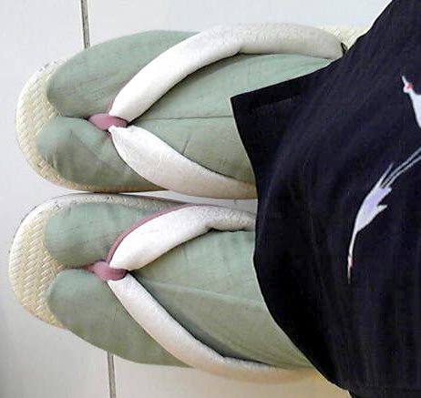 足元。萌葱色の足袋と白の鼻緒の草履です。つぼがピンクなのがかわいい。