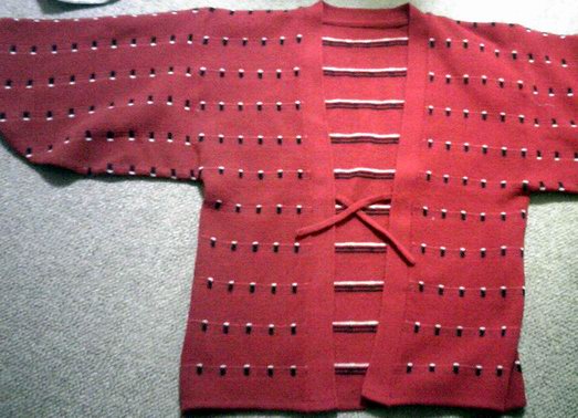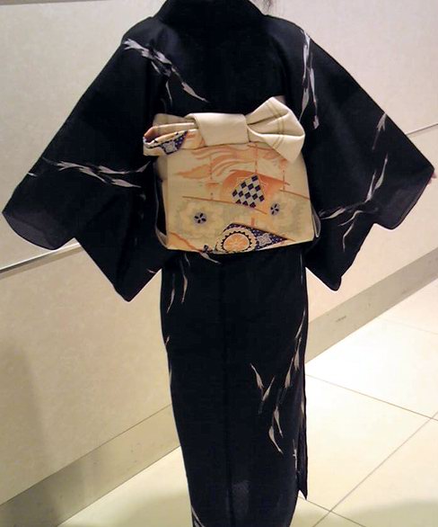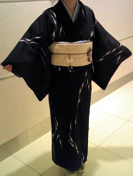 それなりに長さがないと結べないので、本来胴に二巻きするところを一巻きで長さを出しています。しかもこの帯、表側が汚れているので裏が同柄なのをいいことにいつも捻って使ってるので、大変無茶な結び方をしています。でも判らなければいいんです(笑)いや、多少リボンの押さえの部分が歪んでるところにその無茶が出てる訳ですが(笑)