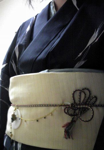 なのでみなせっちの飾りで誤魔化してみる。帯締めはのわこさんが下さった奴、帯揚は麻で青と青灰が染めてあるんですが、分厚いのであんまり夏向きっぽくないです。