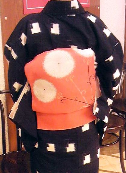 ちょっと判りにくいけど、帯揚げ代わりの端切れは、ひろきさんがいらない布を整理するからと仰って、どさっと色々送って下さったのの一枚です。まだ全然整理出来てないんですが、ぱっと使えそうだったので持ってきました。