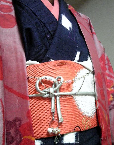 青とオレンジは反対色なので、基本ですね。実際着物は紺なので正確な反対色は黄色なんでしょうけど、その辺の色で合わせていくとあんまり間違いが無いように思います。