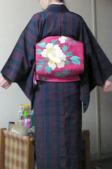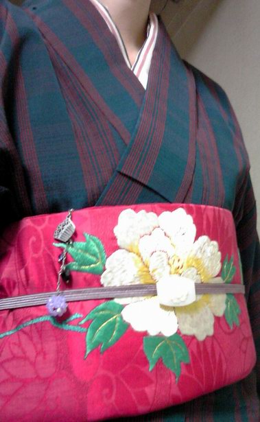 帯はオペラピンクの繻子地に牡丹か?の刺繍。凄く豪勢な感じですが、悪くなったところを切ったのか、作り帯になっています。ちょっと変わった作り帯で結び方を忘れていて、向こうのトイレで結び直した。